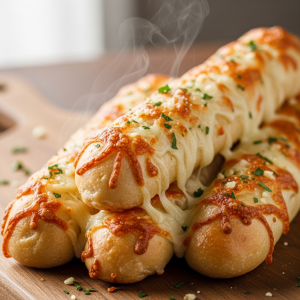 These golden cheesy garlic breadsticks shine as a side to classic Italian dishes like spaghetti Bolognese or creamy Alfredo pasta. For a crowd-pleaser, arrange them on a rustic wooden board garnished with fresh parsley and serve alongside a bowl of zesty marinara. A light drizzle of extra virgin olive oil and a dusting of Parmesan elevate presentation and flavor.Complement the experience with a crisp glass of chilled white wine or a refreshing herbal iced tea.