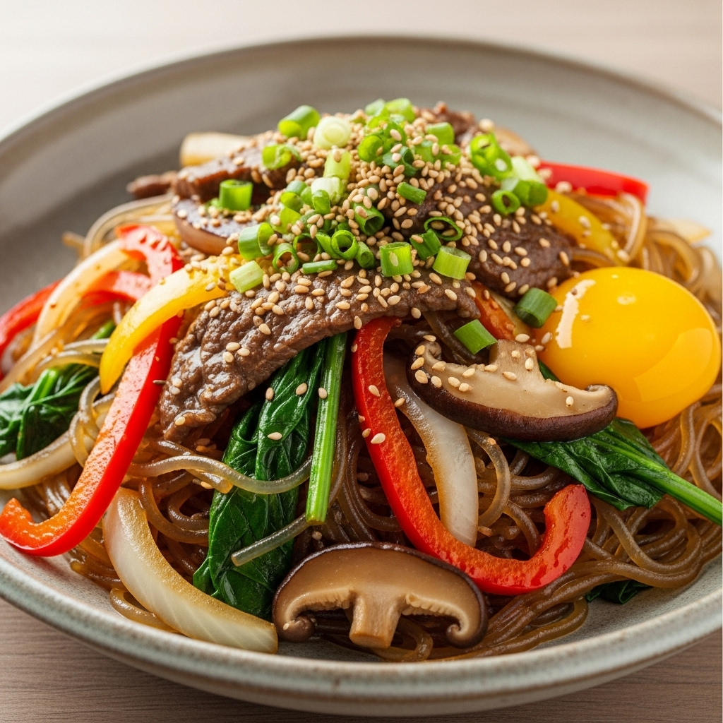 A rainbow of vegetables usually graces Japchae-spinach, carrots, onions, shiitake mushrooms, and bell peppers are common. Eggs are often added as thin omelet strips, and garlic and sesame oil give the dish its aromatic depth. The whole ensemble is topped with toasted sesame seeds for a nutty finish.