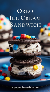 Serve these Oreo ice Cream Sandwiches as a standout dessert centerpiece on a chilled platter, garnished with fresh berries or a drizzle of warm chocolate sauce. To brighten the look, sprinkle crushed Oreos or edible gold dust on top. Pair with a tall glass of cold milk or a homemade iced coffee to balance the sweet and rich flavors.