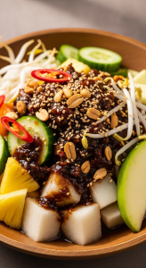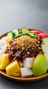 Rojak Unveiled: A Colorful Mix of Fruits and Veggies Delight - vibrant plate of mixed fruits and vegetables with peanut dressing